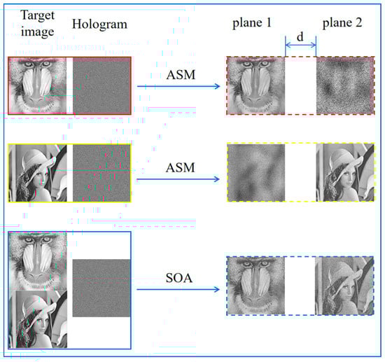 Figure 3 illustrates the relationship between the ASM and the sequential optimization algorithm (SOA). While a hologram generated by the ASM can produce a clear image at a specified distance, it may exhibit speckle noise at other distances. Therefore, each reconstruction plane generated by the sequential optimization algorithm can be affected by speckle noise from other planes, which highlights the need to minimize this impact. Selecting the most appropriate constraint factor for different reconstruction layers can significantly improve their reconstruction accuracy.