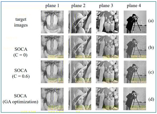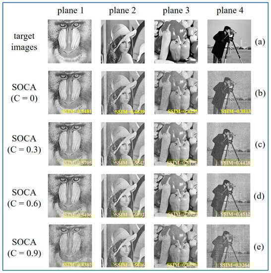 Figure 5. Structural similarity index measure of four planes under different constraint factors C. (a) Target images, (b) simulation image when constraint factor C is 0, (c) simulation images when constraint factor C is 0.3, (d) simulation image when constraint factor C is 0.6 and (e) simulation images when constraint factor C is 0.9.