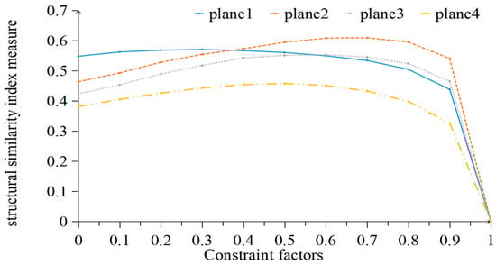 Figure 5 and Figure 6 depict the simulation diagrams of SSIM under different constraint factors, where the same constraint factor is selected for each plane. The first-floor plane is located at a distance of 0.4 m from the SLM, and the distance between the planes is 0.1 m. Adding a constraint factor can decrease the imaging accuracy of the first-layer plane, but can improve the imaging accuracy of other planes. When the constraint factor is set to 0, this corresponds to the traditional sequential optimization method. As the constraint factor is increased from 0 to 0.6, the SSIM of all three planes, except the first plane, is improved. However, when the constraint factor exceeds 0.6, the SSIM of all planes decreases. Through extensive simulation analysis, it has been found that using the complex amplitude of the current plane to constrain the reconstruction amplitude can enhance the reconstruction quality of other planes, except the first plane. However, the accuracy of the distal plane is still low, which is due to the uniform selection of constraint factors for each reconstruction layer. To improve the accuracy of the reconstructed image on the distant plane, it is necessary to set different constraint factors. Therefore, more suitable optimization methods are required to enhance image accuracy in distant reconstruction layers.