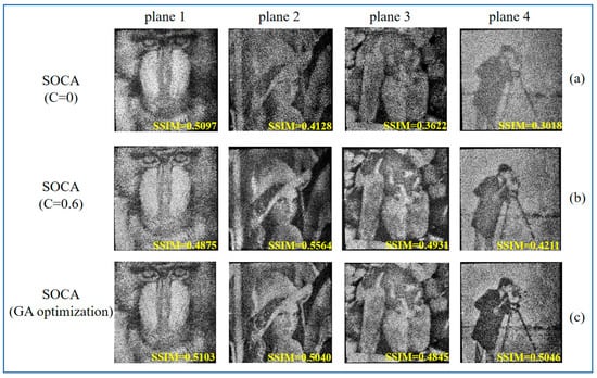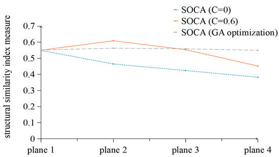 Figure 8. Structural similarity index measure under SOCA (C = 0), SOCA (C = 0.6) and SOCA (GA optimization).