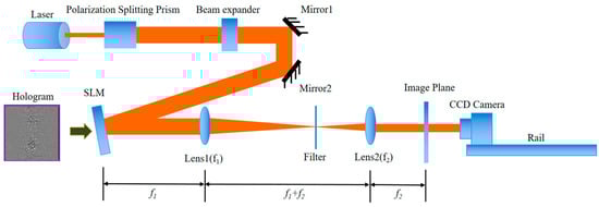 The schematic diagram of the experimental setup is shown in Figure 9. The laser beam from a picosecond laser amplifier (beam diameter: D = 2.5 mm, wavelength: λ = 632 nm, pulse duration: tp = 10 ps, and repetition rate: fr = 100 kHz) passed through a polarization splitting prism, an attenuator, two mirrors, and a half-wave plate, and was then reflected by the SLM (Hamamatsu X13138-02, Shizuoka, Japan) with a 10° angle of incidence. Two positive lenses (focal length: f1 = 300 mm, f2 = 150 mm) formed a 4f imaging system. A CCD camera was used to observe the diffraction patterns. The distance (d) from the first plane to the imaging plane is 0.4 m, and the spacing between planes is 0.1 m.