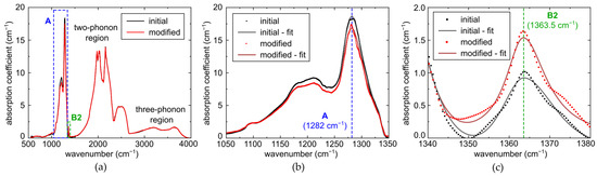 IR absorption spectra of the studied diamond: (a) the general view of the spectrum before (black line) and after (red line) laser exposure; (b) enlarged part of the spectra with A center peak (1282 cm−1) and B1 center area (1175 cm−1); (c) enlarged part of the spectra with B2 peak (1363.5 cm−1) and fitting curves.