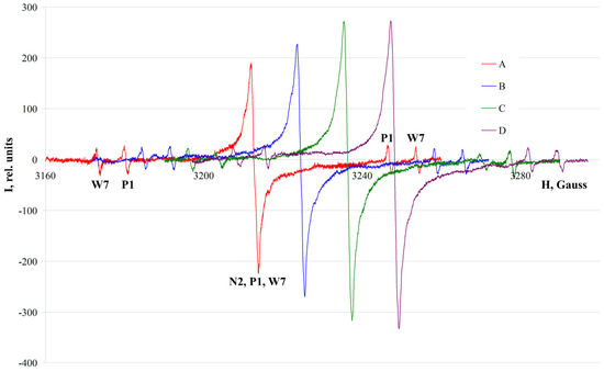 The EPR spectra of the studied diamond crystal are shown in Figure 3, among them those taken before (line A) and after the laser exposure (lines B, C, D). Each of them is a superposition of the spectra of three paramagnetic centers: P1, W7, and N2.