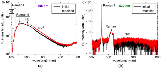 The photoluminescence spectra of the diamond sample acquired before and after the laser exposure are shown in Figure 4.