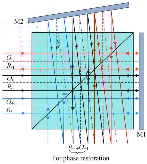 where n is the grating diffraction order, EO and ER are the amplitudes of the object beam and the reference beam in the input plane, φo(x, y) is the specimen phase distribution, and Cn is the n-Fourier complex coefficient modulated by a sin(·) function due to the use of TG. Along the x-axis, a phase shift of 2πnu0/dg is introduced by the initial transverse displacement u0 of TG with a grating period of dg [25,26]. It should be noted that an additional phase shift is obtained by translating TG; the object beam and reference beam should derive from different diffraction orders. Due to the tilt of M2, the object beam On1 from the copies of n1 order reflected by M2 is shifted to interfere with the reference beam Rn2 from the copies of the n2 order reflected by M1. Then, the intensity of the hologram can be expressed as: