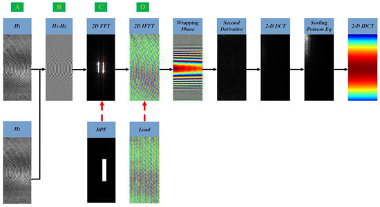To efficiently and accurately eliminate the carrier and background phases, algorithms utilizing specimen-free holograms have been proposed [16]. Compared with fitting techniques and some phase compensation methods [30,31,32,33], this algorithm can remove the background phase without complicated processes or high computational costs. Assuming that specimen-free holograms with intensity distributions and are captured at the same phase shift ∆α and processed through steps A to D, as illustrated in Figure 3, the result obtained is as shown in Equation (9):