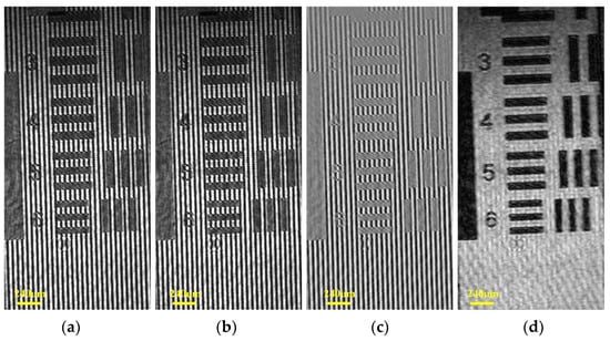 In order to test the spatial resolution of the system, two phase-shifted holograms were obtained by capturing the region of element three to six in Group 2 of the resolution plate, as shown in Figure 6a,b. After acquiring the subtracted hologram shown in Figure 6c, the intensity distribution could be reconstructed according to the angular spectrum algorithm [36]. It can be seen in Figure 6d that the feature of the sixth element could be clearly imaged. According to the line pair numbers of the USAF resolution plate, the lateral resolution of the system could reach at least 70.15 µm. It is worth mentioning that the imaging resolution of the system depends on the laser wavelength, the pixel size of the CCD camera, carrier frequency, and the size of the sample [37,38,39].