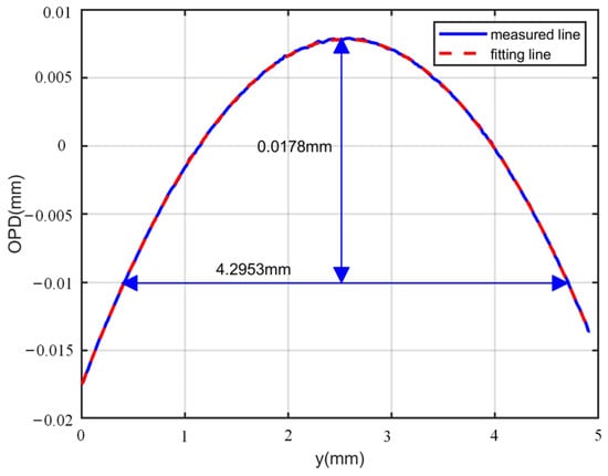 In the second experiment, a plano-convex cylinder lens (CYX0011, Union Optical, China) with a focal length of 250 mm was firstly used as the specimen to evaluate the ability to acquire thick phase specimens. The plano-convex cylinder lens had a standard refractive index of 1.515 mm and a radius of curvature of 128.67 mm. As shown in Figure 7a, the first hologram was obtained in the first shot. Then, moving TG, another hologram with a phase shift of 4π/5 rad could be obtained in the second shot, as shown in Figure 7b. In order to eliminate the DC term, a subtraction operation was performed on the two holograms, and the result is shown in Figure 7c. As shown in Figure 7d, the DC term wes eliminated due to the subtraction of two holograms. Moreover, the real image and the twin image were completely separated from each other. We used the BPF enclosed by the red dashed line in Figure 7d and reconstructed the complex amplitude of Figure 7c by Equation (10). To acquire the phase of the specimen under test, two specimen-free carrier holograms with a phase shift of 4π/5 rad were also acquired, as shown in Figure 7e,f. As shown in Figure 7g, due to the large range of the measured specimen phase values, only a wrapped phase could be obtained by Equation (10). After phase unwrapping, the measured specimen phase distribution was as shown in Figure 7h. In order to further evaluate the effectiveness of the proposed method, we performed quantitative calculations of the unwrapped phase. The 1D optical path difference (OPD) profile [6] is mapped along the blue dashed line in Figure 7h, as indicated by the blue line in Figure 8. A polynomial fit to the measured profile was performed to obtain the red dashed fitting line in Figure 8. Based on the contour geometry relationship shown in Figure 8 [40], the radius of curvature and focal length of the specimen were calculated to be 129.12 mm and 251.27 mm, respectively. The relative error of the focal length could be calculated as 0.508%, which demonstrates the quantitative measuring ability of the system.