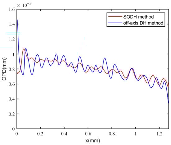 To compare the reconstruction performance of our method with conventional off-axis DH, the specimen phases were also reconstructed using Figure 7a,e. The spectrum of Figure 7a is shown in Figure 9a, and the DC term was still retained in the spectrum. We used the same reconstructed phase procedure as well as the same filter to obtain the reconstructed wrapped and unwrapped phases via the off-axis DH method, as shown in Figure 9b,c. To quantitatively evaluate the reconstruction performance of the SODH method and the off-axis DH method, we calculated the 1D phase profiles along the white dashed line direction marked in Figure 7h and Figure 9c, as shown in Figure 10. The standard deviations of the phase fluctuations indicated by the red and blue lines in Figure 10 were 0.538 rad and 0.876 rad, respectively. A smaller fluctuation appeared in the reconstructed results of the SODH method, which implies that the proposed method can achieve a higher reconstruction quality compared to the off-axis DH method.
