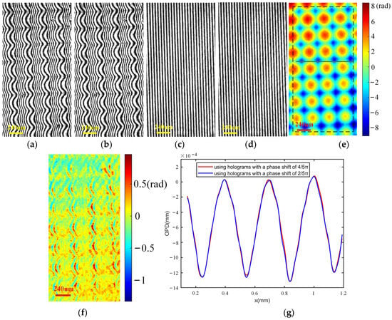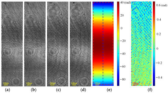 Experimental results of a plano-convex cylinder lens using a different shift introduced by TG. (a,b) Specimen holograms captured with a phase shift of 2π/5 rad between them; (c,d) specimen-free holograms captured with a phase shift of 2π/5 rad between them; (e) retrieved final phase (unit: rad); (f) phase difference in the area fenced with the red dashed lines in Figure 7h and Figure 11e (unit: rad).