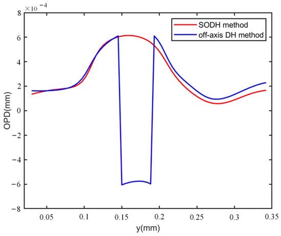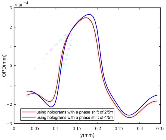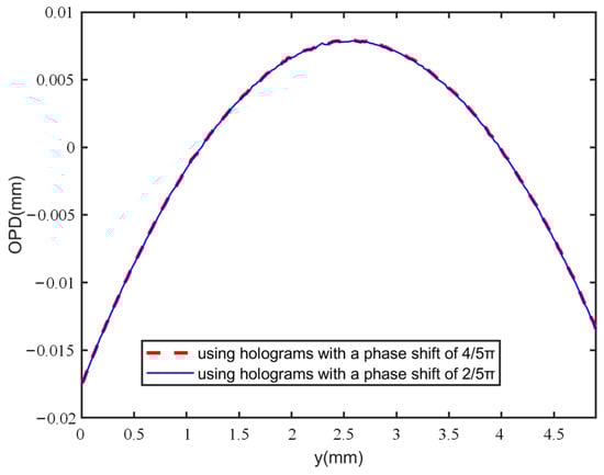One of the advantages of our method is the introduction of random phase shift by the grating. To demonstrate the test performance using carrier holograms with different phase shifts, two specimen holograms of the plano-convex cylinder lens, shown in Figure 11a,b, were captured with a phase shift of 2π/5 rad between them. Figure 11c,d displays the corresponding specimen-free holograms. The unwrapped phases recovered by the proposed method are presented in Figure 11e. Then, we calculated the phase difference between the regions enclosed with red dashed lines in Figure 7h and Figure 11e, and the results are shown in Figure 11f. The RMS of Figure 11f was calculated as 0.1320 rad. Additionally, the 1D phase profiles along the blue dashed line in Figure 7h and Figure 11e were also compared, and the similar profile distributions that were close to each other are shown in Figure 12. The results indicate that different phase shifts utilized in the system did not obviously affect the measurement results. Therefore, the method can achieve low noise and high-precision measurements with a random phase shift.