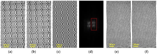 To demonstrate the efficiency of the method, experiments were conducted using the setup shown in Figure 1. In our experiments, the light source is a He–Ne laser with a wavelength λ = 632.8 nm; L1 and L2 are two lenses with a focal length of 250 mm; TG has a period of 50 µm; M1 and M2 are two mirrors of equal size, and the size of both mirrors is 25.4 mm × 25.4 mm; and the pixel size in the CCD camera is 4.8 µm × 4.8 µm, and the resolution is 1280 × 1024 pixels.
