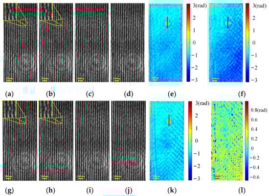 Experimental results of an oil drop. (a,b) Specimen holograms captured with a phase shift of 2π/5 rad between them; (c,d) specimen-free holograms captured with a phase shift of 2π/5 rad between them; (e) retrieved phase using (a–d) by SODH method (unit: rad); (f) retrieved phase by off-axis DH method (unit: rad); (g,h) specimen holograms captured with a phase shift of 4π/5 rad between them; (i,j) specimen-free holograms captured with a phase shift of 4π/5 rad between them; (k) retrieved phase using (g–j) by SODH method (unit: rad); (l) phase difference in the area fenced with red dash lines in Figure 15e,k (unit: rad).