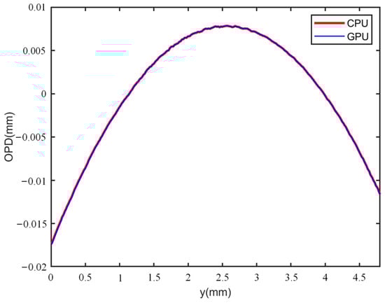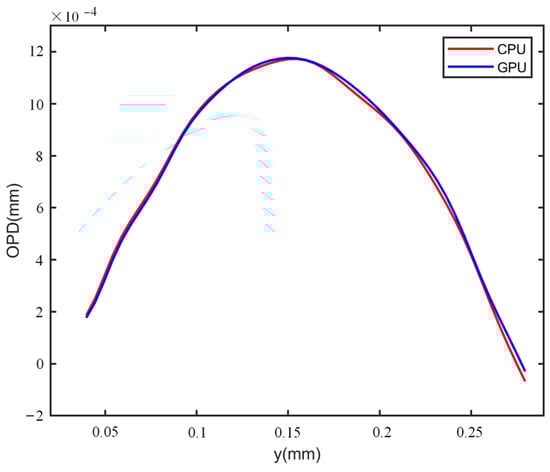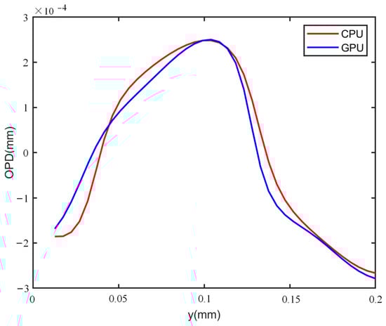 Phase reconstructed comparisons of the GPU implementation and CPU implementation were carried out. The experiments on thick phase specimens were first researched. Using Figure 7a–f, the wrapped and unwrapped phase of the plano-convex cylinder lens could be obtained by GPU-based processing with the flow chart described in Figure 4, and the results are shown in Figure 18a,b. Applying CPU processing, a similar unwrapped phase distribution was achieved, as shown in Figure 18c. Furthermore, the plot of the 1D phase profiles along the green dashed line in Figure 18b,c are drawn in Figure 19. It can be observed from Figure 19 that the two curves exhibit a similar trend of variation, indicating that recovering the phase with the GPU yielded similar results to the CPU. Likewise, the evaluation measurement was implemented on the microlens array. The wrapped phase and the unwrapped phase for GPU processing was obtained using Figure 13a–f, as shown in Figure 20a,b, while the unwrapped phase for CPU processing is shown in Figure 20c. Similar 1D phase profiles along the black line marked in Figure 20b,c were also obtained, as shown in Figure 21. Secondly, the recovery effect of the GPU for thin phase specimens was researched. The holograms shown in Figure 15a–d were selected. The retrieved phase implemented on the GPU is shown in Figure 22a, and the corresponding CPU-implemented result is shown in Figure 22b. To further compare the results of CPU and GPU recovery for thin phases, we drew the 1D phase profiles along the red line in Figure 22a,b, as shown in Figure 23. Figure 23 shows that similar recovery results could be obtained. Through the results presented by the experiments for both thick and thin phase specimens, it was found that a similar reconstructed phase can be obtained by GPU implementation and CPU implementation. Thus, the acceleration of GPU-based parallel phase reconstruction will become the focus of attention in the following work.