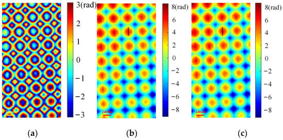 GPU phase recovery results of a microlens array. (a) Wrapped phase for GPU processing (unit: rad); (b) unwrapped phase for GPU processing (unit: rad); (c) unwrapped phase for CPU processing (unit: rad).