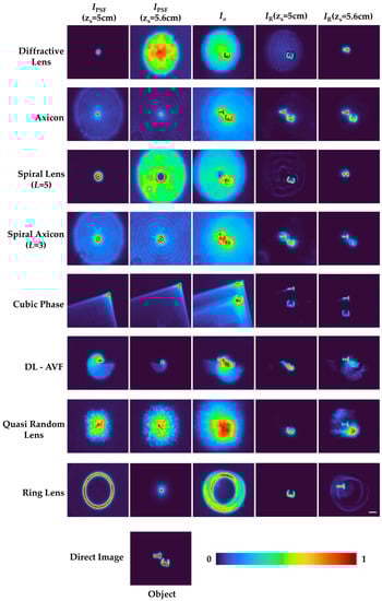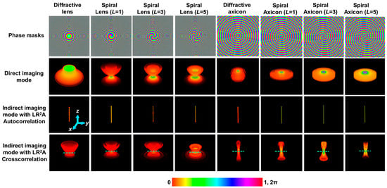 The simulation was carried out by shifting zs from 0.2 to 0.6 m in steps of 4 mm, and the IPSF(zs) was accumulated into a cube matrix (x, y, z, I). The images of the phase masks for diffractive lens, spiral lens (L = 1, 3, and 5), diffractive axicon, and spiral axicon (L = 1, 3, and 5) are shown in row 1 of Figure 2. The 3D axial intensity distributions for different diffractive elements, such as diffractive lens, spiral lens (L = 1, 3 and 5), diffractive axicon, and spiral axicon (L = 1, 3, and 5), are shown in row 2 of Figure 2. The diffractive lens does not have a focal point, as the imaging condition was not satisfied within this range of zs when zh is 0.2 m. For the spiral lens, a focused ring is obtained at the recording plane corresponding to zs = 0.4 m and the ring blurs and expands, similar to the case of a diffractive lens. For a diffractive axicon, a Bessel distribution is obtained in the recording plane and it is invariant with changes in zs [46,47]. A similar behavior is seen in Higher-Order Bessel Beams (HOBBs) [48]. As seen in the axial intensity distributions, none of the beams can be directly used for imaging applications. It may be argued that Bessel beams can be used, but as is known, the non-changing intensity distribution comes at a price, which is the loss of higher spatial frequencies [33]. Consequently, imaging using Bessel beams results in low-resolution images.