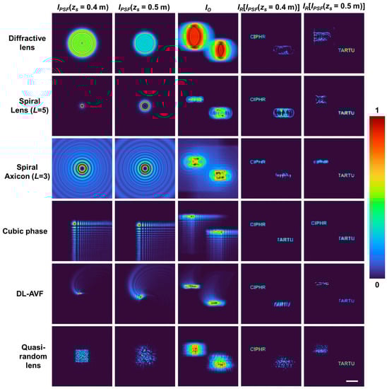 The simulation study of a two-plane object consisting of two test objects with letters “CIPHR” and “TARTU” with zs = 0.4 m and 0.5 m, respectively, is presented next. The images of the IPSFs for zs = 0.4 m and 0.5 m, the object intensity pattern IO obtained by convolution of object “CIPHR” with IPSF (zs = 0.4 m) and convolution of “TARTU” with IPSF (zs = 0.5 m) followed by a summation and the reconstructions IR corresponding to the two planes using LR2A for a diffractive lens, spiral lens (L = 5), spiral axicon (L = 3), cubic phase mask, DL-AVF, and quasi-random lens are shown in Figure 4. As seen from the results in Figure 4, the cases of the diffractive lens and quasi-random lens appear similar with respect to the axial behavior, i.e., when a particular plane information is reconstructed, only that plane information is focused and enhanced, while the other plane information is blurred and weak. However, for the elements such as the spiral lens and spiral axicon, the other plane information consists of “hot spots”, which are prominent and sometimes even stronger than the information in the reconstructed plane. This is due to the fact that there is similarity between the two IPSFs. This is one of the pitfalls of using such deterministic optical fields. The problem with such hotspots is that it is not possible to discriminate if the hotspot corresponds to any useful information related to the object or blurring due to a different plane if the object is not known prior.