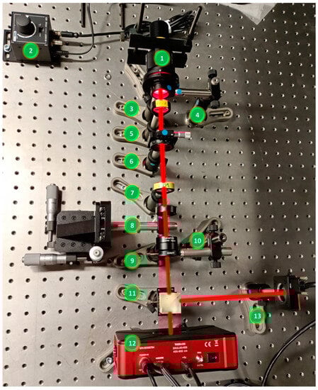 Photograph of experimental setup: (1) LED, (2) LED power controller, (3) iris(I1), (4) diffuser, (5) refractive lens (L1), (6) polarizer, (7) refractive lens (L2), (8) object/pinhole, (9) refractive lens (L3), (10) iris (I2), (11) beam splitter, (12) SLM, (13) image sensor.