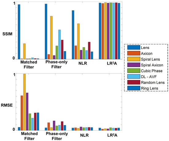 Bar graph of SSIM and RMSE for different reconstruction methods such as matched filter, phase-only filter, NLR, and LR2A.
