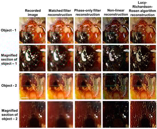 To demonstrate the application of LR2A to real applications in day-to-day life, medical images were obtained from surgeons. A male 65-year-old patient with a known case of prostrate cancer had radiotherapy about a year ago. He developed bleeding and mucous discharge from the anus. The colonoscopy finding shows mucosal pallor, telangiectasias, edema, spontaneous hemorrhage, and friable mucosa. It can be noted that the mucosa was congested with ulceration stricture. The images were captured using colonoscope Olympus system and CaptureITPro medical imaging software. The direct images obtained using the colonoscope are shown in Figure 10. The IPSF can be synthesized in a computer or an isolated dot can be taken from Figure 10, padded with zeros and used as the reconstructing function. The red region indicates telangiectasias and the black region shows necrosis, which is the death of body tissue. The yellow region shows mucosal sloughing, and the magnified region shows the necrotic area with dead mucosa. In this study, the IPSF was synthetic [38,39]. The different color channels were extracted from the image and processed separately using synthetic IPSF and different types of filters, such as matched filter, phase-only filter, NLR, and LR2A, and then combined as discussed in [38]. The NLR was carried out for α = 0 and β = 0.8 and LR2A was carried out for α = 0.2 and β = 1 with n = 20 iterations. The reconstructed images are shown in Figure 9, which shows that LR2A has a better performance compared to other methods.