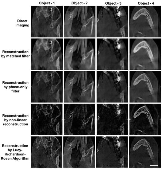 A diagnostic imaging equipment, Cone beam computed tomography (CBCT), was used for imaging a patient with focal spot 0.5 mm, field of view 8 × 8 cm, voxel size 0.2 mm/0.3 mm, and exposure time 15.5 s. The images obtained for a patient with multiple implants placed in the jaw with metallic artifacts compromised the clarity and blurred the finer details, as shown in row 1 of Figure 11. Once again, synthetic IPSF and LR2A were used to improve the resolution and contrast of the images. The images were reconstructed using different types of filters, such as matched filter, phase-only filter, NLR, and LR2A. The reconstructed images have a better resolution and contrast compared to the direct images. The NLR was carried out for α = 0 and β = 0.7 and LR2A was carried out for α = 0.3 and β = 1 with n = 20 iterations. The reconstructed images are shown in Figure 11, which shows that LR2A has a better performance compared to other methods.