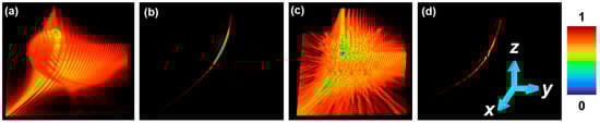 In this study, LR2A and the indirect imaging concept have been used as a tool to transfer the 3D imaging characteristics faithfully from the beam to the imaging system [42,43,51]. In our recent study [51], the possibility of tuning axial resolution of an imaging system after completing the recording process has been demonstrated by post hybridization methods. The same can be achieved with the common and exotic beams. A hybrid PSF IHPSF can be formed by summing the pure IPSFs with appropriate weights w in the following form: . The object intensity distribution can be hybridized by the same weights as used for creating the hybrid PSFs as . The object information can be reconstructed with the effective imaging characteristics using LR2A. Two cases are simulated here. In the first case, hybridization has been achieved between the Airy pattern and self-rotating beam, and in the second case, hybridization has been achieved between the Airy pattern and quasi-random lens. The 4D intensity distributions generated for the hybrid PSFs are shown in Figure 12a,c for cases 1 and 2, respectively. The reconstructed 4D patterns using LR2A for cases 1 and 2 are shown in Figure 12b,d, respectively. As expected, the focal depth decreased in the second case Figure 12d more than the first case Figure 12b, as the second ingredient in the second case has a high axial resolution. This study is not limited to only two ingredients, but any type of ensemble with m number of beams can be constructed easily post-recording.
