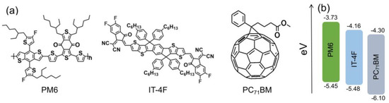 (a) Molecular structures and (b) energy level structures of PM6, IT−4F, and PC71BM.