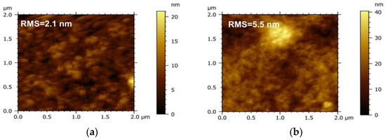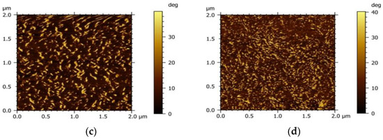 To investigate the influence of the acceptor on the morphology of the active layer, the micro-morphology of the PM6 blend with different acceptors (IT−4F or PC71BM) was characterized by the tapping mode of AFM, as shown in Figure 4. It can be seen that the surface roughness of the PM6:IT−4F is 2.1 nm (Figure 4a), while the surface roughness of the PM6:PC71BM increases to 5.5 nm (Figure 4b). The increased roughness means that the surface undulation is more obvious and also indicates that the flatness of the surface is weakened, which may reduce the Ohmic contact among the active layer, MoO3, and Ag electrode [40]. In addition, the active layer with smaller roughness usually represents the refined self−aggregation scales of the D and A phases (Figure 4c,d), which will facilitate the fast diffusion of the photogenerated exciton to the D/A interface for dissociation [41].