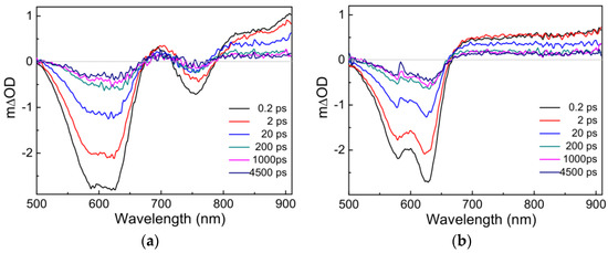 Transient absorption spectra of (a) PM6:IT−4F and (b) PM6:PC71BM active layers. The excitation wavelength is 600 nm with a photoexcitation fluence of 1.8 × 1012 photons cm−2 pulse−1.