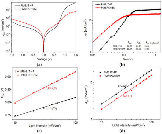 (a) Dark J−V curves of two OSCs. (b) Jph−Veff of two OSCs. (c) VOC versus light intensity of two OSCs. (d) JSC versus light intensity of two OSCs.
