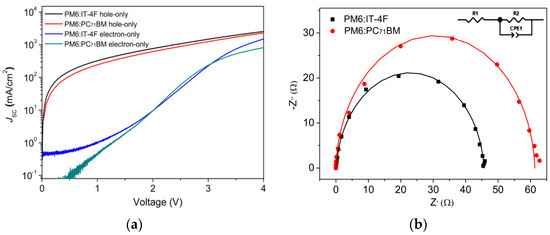 J, ε0, εr, μ, V, and L are current density, vacuum dielectric constant (8.85 × 10−14 F/cm), the relative dielectric constant of polymer (εr = 3), charge mobility, bias voltage, and thickness, respectively. By calculation, the hole mobilities of PM6:IT−4F and PM6:PC71BM devices are determined as 5.4 × 10−4 and 4.9 × 10−4 cm2·V−1·s−1. Similarly, the electron mobility values of corresponding devices are 3.2 × 10−4 and 1.7 × 10−4 cm2·V−1·s−1. Thus, the µh/µe values can be determined as 1.69 and 2.88. Hence, high charge mobility and good charge transport balance are shown in the PM6:IT−4F device. Figure 8b shows the EIS measurements of two devices. An equivalent circuit (inset picture in Figure 8b) was used to fit the EIS spectra. By fitting the charge–transfer resistance, R2 values are determined as 45.5 Ω and 61.3 Ω. This indicates that better Ohmic contact is formed between the PM6:IT−4F active layer and the electrode, leading to better charge collection, which supports the aforementioned results.