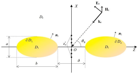 We consider scattering of a linearly polarized electromagnetic plane wave by a dimer consisting of two identical axisymmetric homogeneous particles placed in an isotropic homogeneous medium, as shown in Figure 1. Particles occupy the domain with smooth boundary , where and the external region is denoted as . By assumption, the particles have a common axis of symmetry Oz.