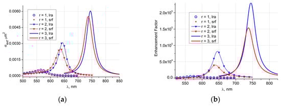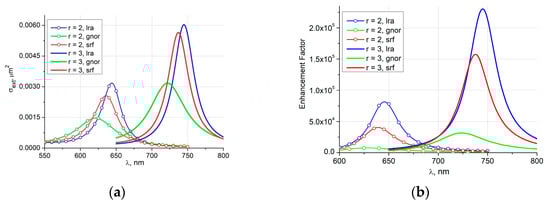 In Figure 3, one can observe the results corresponding to prolate spheroids with an equivolume diameter D = 14 nm and a gap for different aspect ratios r = 1, 2, 3. Case r = 1 corresponds to a sphere. Figure 3a,b demonstrate, respectively, the extinction cross section (18) and the enhancement factor (19), obtained with the LRA and SRF theories. It can be noticed that an increase in the aspect ratio leads to a spectral shift of the PR by almost 100 nm for each ratio value and is accompanied by an increase in its amplitude. Again, accounting for the surface quantum effect leads to PR damping and a blue shift of 5 to 10 nm.