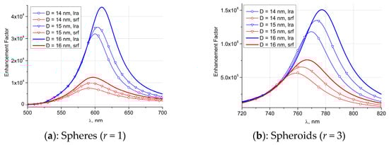Figure 5a presents the enhancement factor for a dimer with a gap of for spherical particles with diameters D = 14, 15, 16 nm. The SRF plots indicate a damping of the plasmon resonance by almost a factor of four, accompanied by a slight spectral blue shift of 10 nm. Similar results can be seen in Figure 5b, which demonstrates graphs corresponding to prolate spheroids with the aspect ratio r = 3 and gap size δ = 0.5 nm. Obviously, the field enhancement for the spheroids is almost an order of magnitude greater than the spheres. Accounting for the quantum effect results in enhancement factor damping by almost 50%, accompanied by a blue shift of about 10 nm.