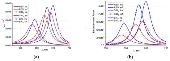The results presented in Figure 2, Figure 3, Figure 4 and Figure 5 were obtained for the R6G medium with a refractive index ne = 1.326. Let us consider how the extinction cross section and the enhancement factor change if a dimer with the axis ratio r = 2 and the gap δ = 1 nm is placed in a denser medium. Let us choose, for example, SiO2 and BK7 glasses with the refractive indices ne = 1.46 and ne = 1.52, respectively. The corresponding results can be seen in Figure 6. An increase in the environment refractive index leads to an increase in the ratio of particle size to the excitation wavelength. This circumstance yields a shift of the PR to the long wavelength region and growth of its amplitude.