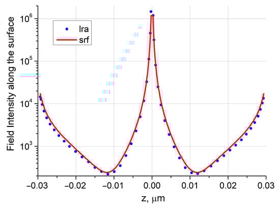 Figure 8 demonstrates the distribution of the relative electric field intensity along the meridians of the particles, including the gap. Calculations were performed for dimer parameters D = 14 nm, r = 3, δ = 0.5 nm, λ = 770 nm and R6G environment. As can be seen from the graphs, the maximum intensity value is in the center of the gap (z = 0), and the intensity also has large values on the opposite sides of the particles.