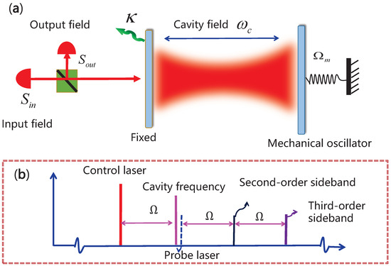 (a) The physical diagram of a traditional optomechanical system, in which one mirror is fixed and the other is movable and treated as a mechanical oscillator. The system is pumped by a strong input field and the output field of the system can be analyzed by a spectrum detector. , , and represent the dissipation of the cavity field, the eigenfrequency of the cavity field, and the intrinsic frequency of the mechanical oscillator, respectively. (b) Frequency spectrum of the optomechanical system. The red line represents the control laser, which is detuned by from the cavity frequency. Second-, third- and high-order sidebands appear in the transmission spectrum.