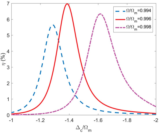 Up to now, we have mainly focused on the influence of OMIT on the third-order sideband generation. Now, however, we turn to discuss how to increase the amplitude of the third-order sideband by regulating the detuning between the cavity field and the control field . The efficiency of the third-order sideband process varies with the driving frequency and the detuning is plotted in Figure 5. Here, the pumping field power used is = 5 mW. In the case of , the efficiency of the third-order sideband is only about , the same as in Figure 2. With the change of the control field detuning, the amplitude of the third-order sideband has greatly increased. Specifically, the amplitude of the third-order sideband increases to about when the control field detuning is taken to .