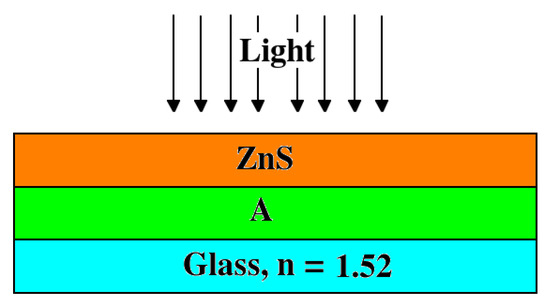 The experiment consisted of obtaining the absorption of a ZnS film on a glass substrate like Figure 5 with ZnS 2 m of thickness. The thickness of the substrate was 1 mm. We introduced the film to visible spectrum equipment and obtained the absorption (A). The equation for the transmission (T) of light through material media related to A is