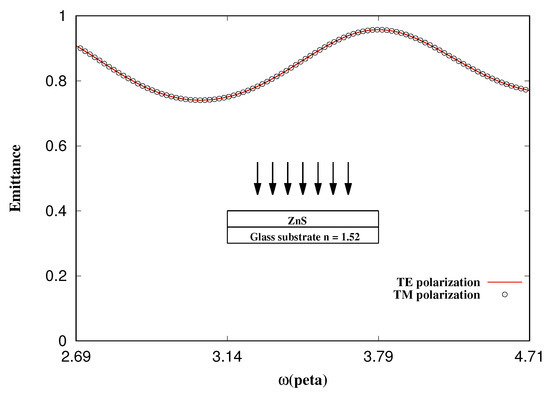 With the transfer matrix method (TMM) and TE polarization, normal light will be incident on the material arrangement surface as shown in Figure 1. We only worked with TE polarization due to the fact that the reflection or emittance (1-R) results are similar for both TE and TM polarization; see, for example, Figure 2. The TMM is used in optics and acoustics to analyze the propagation of electromagnetic or acoustic waves through a stratified medium [18]. The selected materials with different dielectric constants at room temperature are zinc sulfide (ZnS), silicon (Si), silicon dioxide (SiO), hafnium dioxide (HfO), selenide of plome (PbSe), and lead sulfide (PbS) [19].
