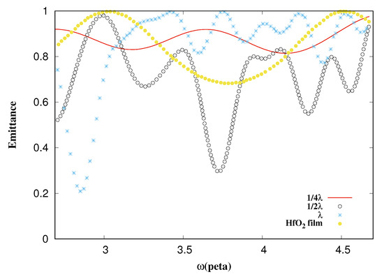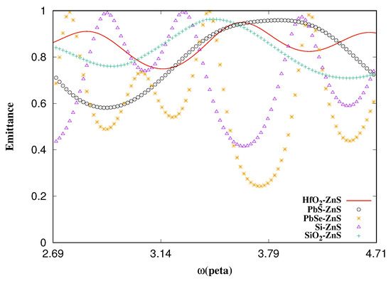 Emittance vs. frequency. Thickness of 300 nm of each layer. We used the configuration shown in Figure 1 to obtain the emittance.