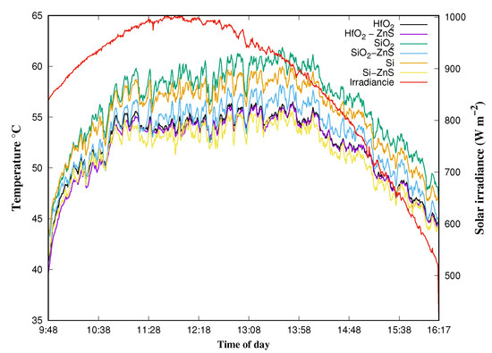However, a challenge arose in measuring the temperature on the material’s surface. Initially, a thermal camera was employed. However, obtaining accurate temperature measurements with this camera proved difficult due to the materials’ varying emissivity with temperature and material radiation (which is not constant). Consequently, a design was pursued involving a round, flat metallic body that would make direct contact with the material’s surface. This metallic body was connected to thermocouple cables to facilitate temperature sensing. Additionally, solar radiation was measured using a radiation sensor. The solar irradiance curve obtained bears a striking resemblance to curves observed in other studies [4]. It is important to acknowledge that the curve presented in this paper cannot be expected to perfectly match those from previous studies due to geographical variation.