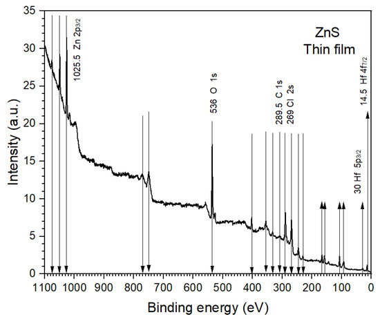 There are several methods for manufacturing thin films. In our case, we used screen printing to add a ZnS layer onto Si, SiO and HfO wafers as well as onto a glass substrate. To apply a layer of this material, it first had to be manufactured in the laboratory and then applied as a fresh coat of paint using the aforementioned silk-screen printing method. To ensure that the indicated materials were deposited onto the substrate and wafers, samples were taken and analyzed using X-ray photoelectron spectroscopy (XPS) equipment in order to confirm that the samples used in the experiment contained the materials discussed in this study, for example ZnS, hafnium, SiO, and Si (Figure 7, Figure 8 and Figure 9).