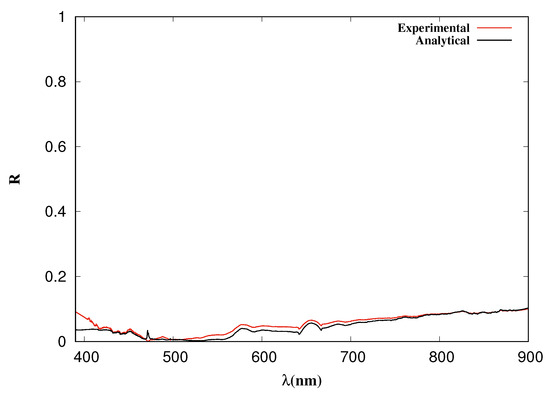 Reflection of a thin film vs. wavelength. The red line is the experimental R of ZnS film with 2 m of thickness on a substrate. The black line is analytic reflection using a virtual dielectric constant with thickness of 110 nm; the impinging media was a glass of n = 1.5.
