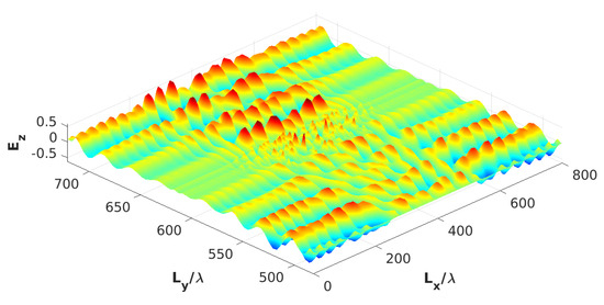 The field inside FDTD with a film of ZnS and pyramids of Si at the center. = 600, where and are lengths. The impinging beam is a pulse of 1.77 (Femto s).
