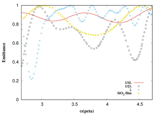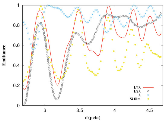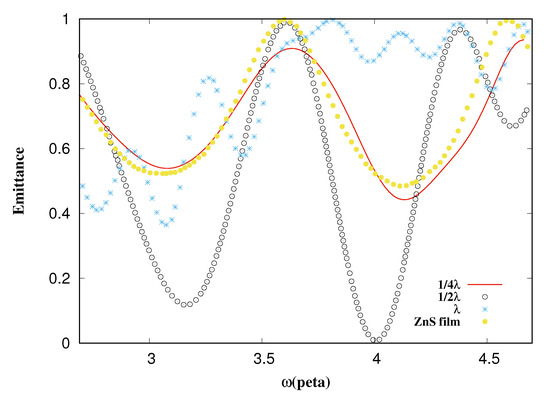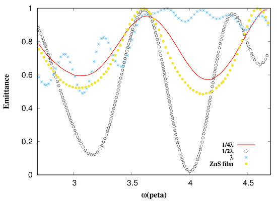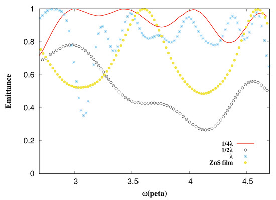 It is observed from Figure 14 that there is a decrease in emittance with the measure of separation and sides of Si pyramids on a ZnS thin film with . The decrease in the emittance of Figure 14 and the next figures is the optimal length for the size of the triangles on the surface.