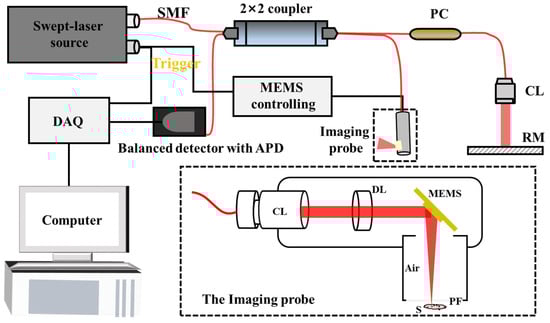 Figure 1 shows the configuration of the SS-OCT system (LVM-1000, Light Vision, China). A swept laser source (HSL-20, Santec, Japan) was utilized to emit a 1310 nm laser beam with a 100 nm bandwidth. The laser is transmitted through a single-mode fiber (SMF) and divided into two laser beams via a 2 × 2 coupler. One laser beam reaches the mirror in the reference arm through a polarization controller (PC) and a collimator (CL), while the other laser beam passes through the sample arm whose end is an MEMS-OCT probe. Interference signals are produced by the two laser beams reflected back from the reference arm and sample arm (imaging probe), respectively, and are detected via a balanced photodetector (PDB570C, Thorlabs, USA). Then, the signals are collected using a high-speed data acquisition card (ATS-9350, Alazar Inc., Canada) with a sampling rate of 250 MS/s. An MEMS controller is used to drive the MEMS mirror to generate 2D raster scanning and thus realize 3D OCT imaging. An external trigger signal is used to keep the synchronization among the laser emitting, MEMS scanning, and data acquisition.