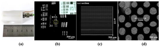 A photograph of the probe is shown in Figure 3a, which is miniaturized and suitable for handheld imaging. To evaluate the spatial and lateral resolution of the SS-OCT probe, we imaged the pattern of a resolution plate. The minimum 5–3 line pair can be distinguished, indicating a practical imaging resolution of 25 μm, as shown in Figure 3b. We also tested the penetration depth of the probe by imaging the stack of cover glass with a known layer thickness of 150 μm. Figure 3c shows that the maximum number of observed cover glass is about 22, which corresponds to the penetration depth of 3.3 mm. In addition, we also imaged the photolithography patterns with known scales, and tested the FOV of the probe, which is about 3 × 3 mm2, as shown in Figure 3d.