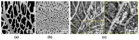 To determine the performance of the miniaturized SS-OCT probe, we applied it to observe the biological specimens with dense vein structures. Figure 4a,b shows the imaging results of the veins’ texture in two leaves, showing sparsely and densely reticular structures, respectively. In addition, we also captured the veins of dragonfly wings, which were quadrilateral or pentagonal grids, as shown in Figure 4c. The enlarged view of a localized dragonfly wing marked with a yellow dash box shows that the wings were filled with complicated columnar structures, which played important roles during flight, helping to keep the wings from becoming stuck to each other with water and dust. These results demonstrated the potential of the SS-OCT microscope in high-resolution observation of microstructures of biological specimens.