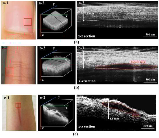 Photographs and corresponding SS-OCT imaging results of a fingernail (a), finger joint (b), and inner wrist skin (c). (a-1) The observation of a fingernail under biological microscopy. (a-2,a-3) The 3D visualization and x-z section view of the fingernail structure via SS-OCT imaging. (b-1) The observation of a finger joint under biological microscopy. (b-2,b-3) The 3D visualization and x-z section view of the skin structure in figure joints via SS-OCT imaging. (c-1) The observation of a volunteers’ inner arm wrist under biological microscopy. (c-2,c-3) The 3D visualization and x-z section view of the localized scalded skin on a volunteer’s inner wrist.
